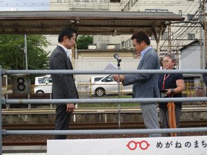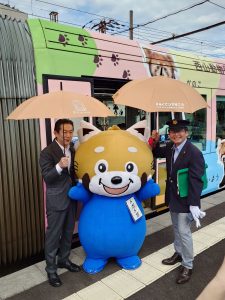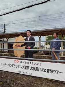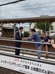 令和7年9月20日(土)、福井鉄道福武線神明駅構内で開催された鯖江市市制70周年記念イベント「レッサーパンダラッピング電車お披露目式」内で贈呈式を行いました。